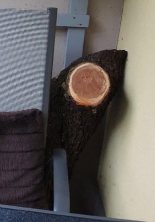 Oben haben wir diese Konstruktion geschaffen. Das Brett, auf dem Slimmy oben ankommt, liegt zum einem auf dem Baumstamm auf, zum anderen auf der „übriggebliebenen“ SAT-Spiegel-Halterung. Damit auch ganz sicher nichts wackeln kann, ist dazwischen noch dieses kleine Holzdreieck zur Stütze angebracht.