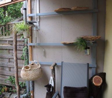 Wie man hier sieht ist es möglich, für wenig Geld und ein paar guten Ideen für seine Lieblinge, ein kleines abwechslungsreiches Katzenparadies zu schaffen. Aber du kannst die Terrasse nun „auch “ benützen (wie man am Foto –> Sessel sieht).